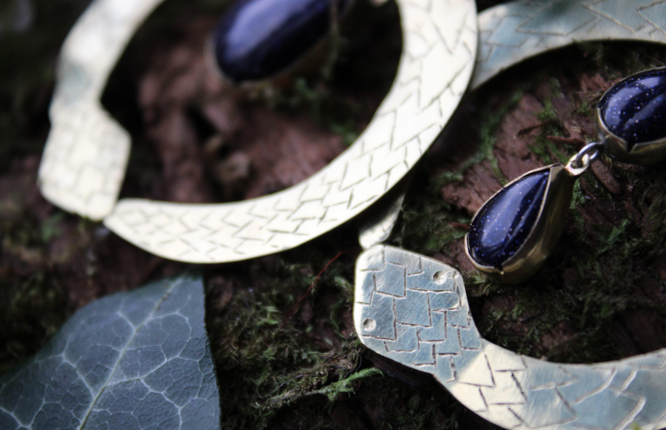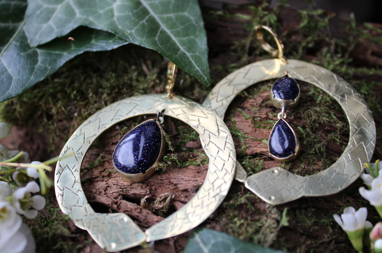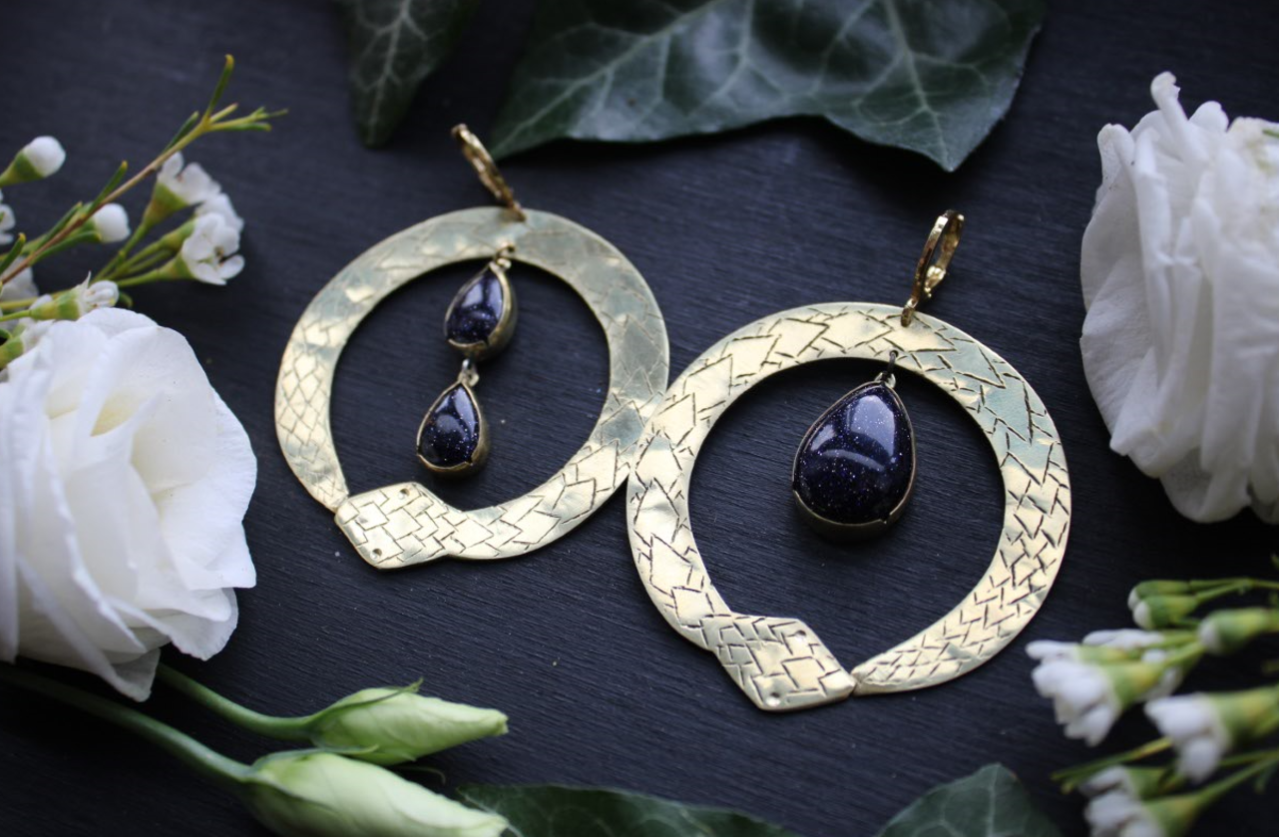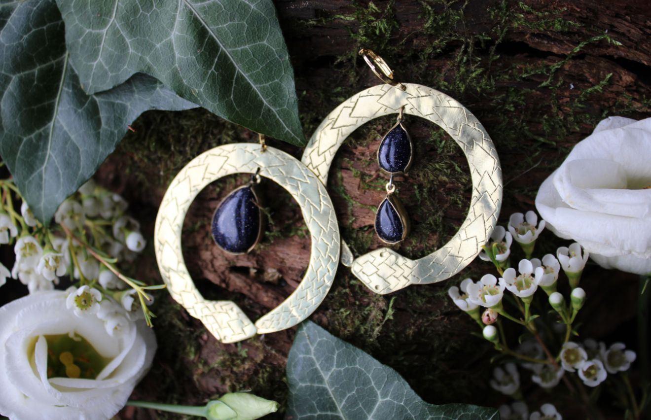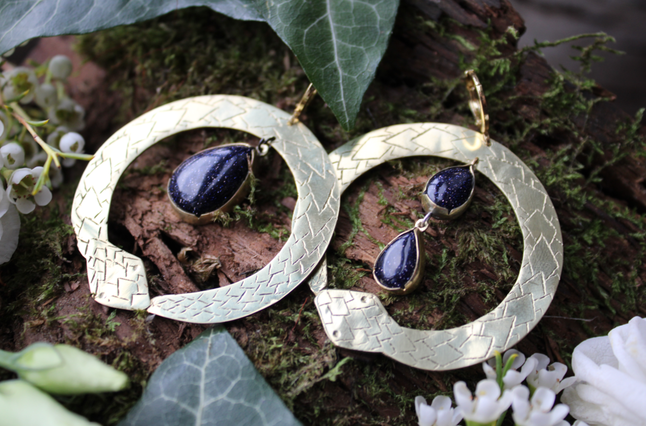 The ourobouros is a symbol of the snake eating it's own tail, representing eternity and the cyclical nature of life, death, and regeneration. These snakes are engraved on brass encircling sparkly blue sunstone teardrops, hanging from gold-filled hoops.