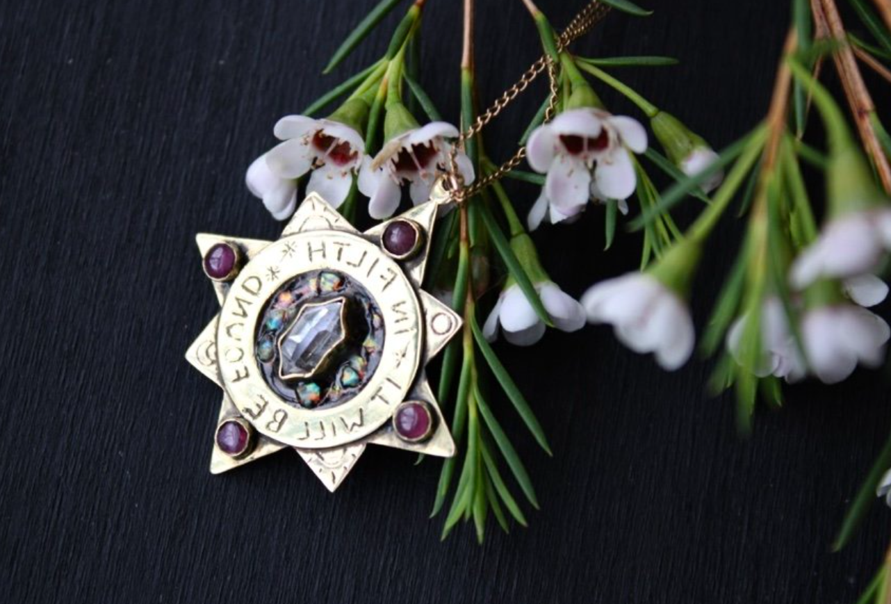 Taking this concept quite literally, a sparkly Herkimer diamond can be found surrounded by resin mixed with dirt and shards of opal. Rubies decorate each compass point on this brass pendant, hanging from an 18” gold filled chain.