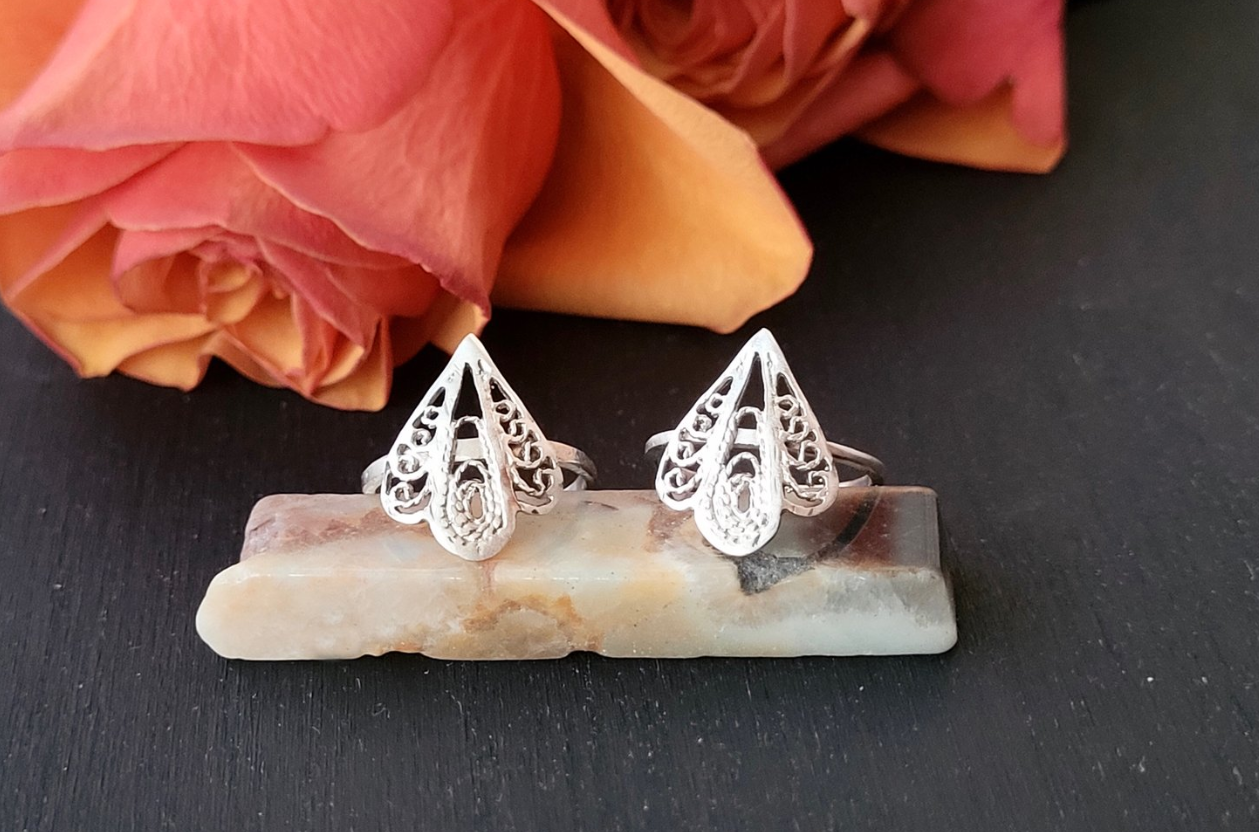 A sterling silver ring made from a vintage filigree earring. Two available in size 4 or 4 1/2, this delicate ring fits nicely on your knuckle or pinky.