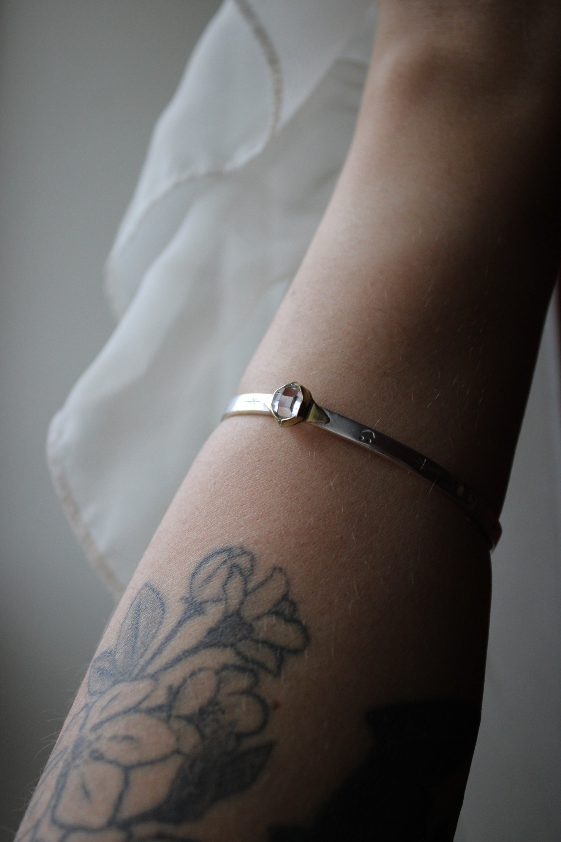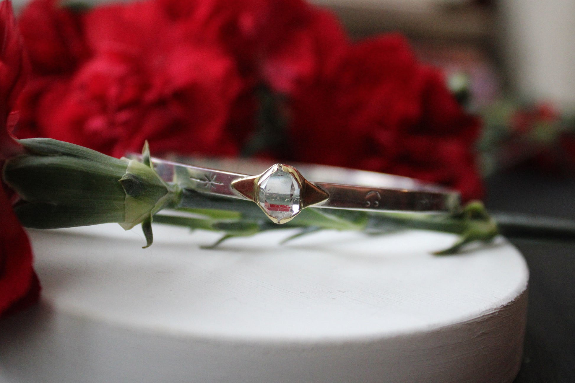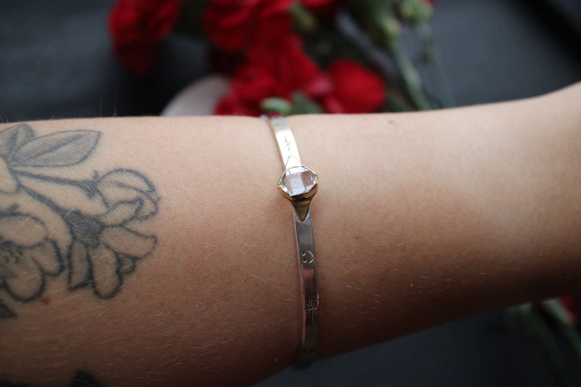 Cheerfully engraved sterling silver, decorated with a Herkimer diamond surrounded by brass.