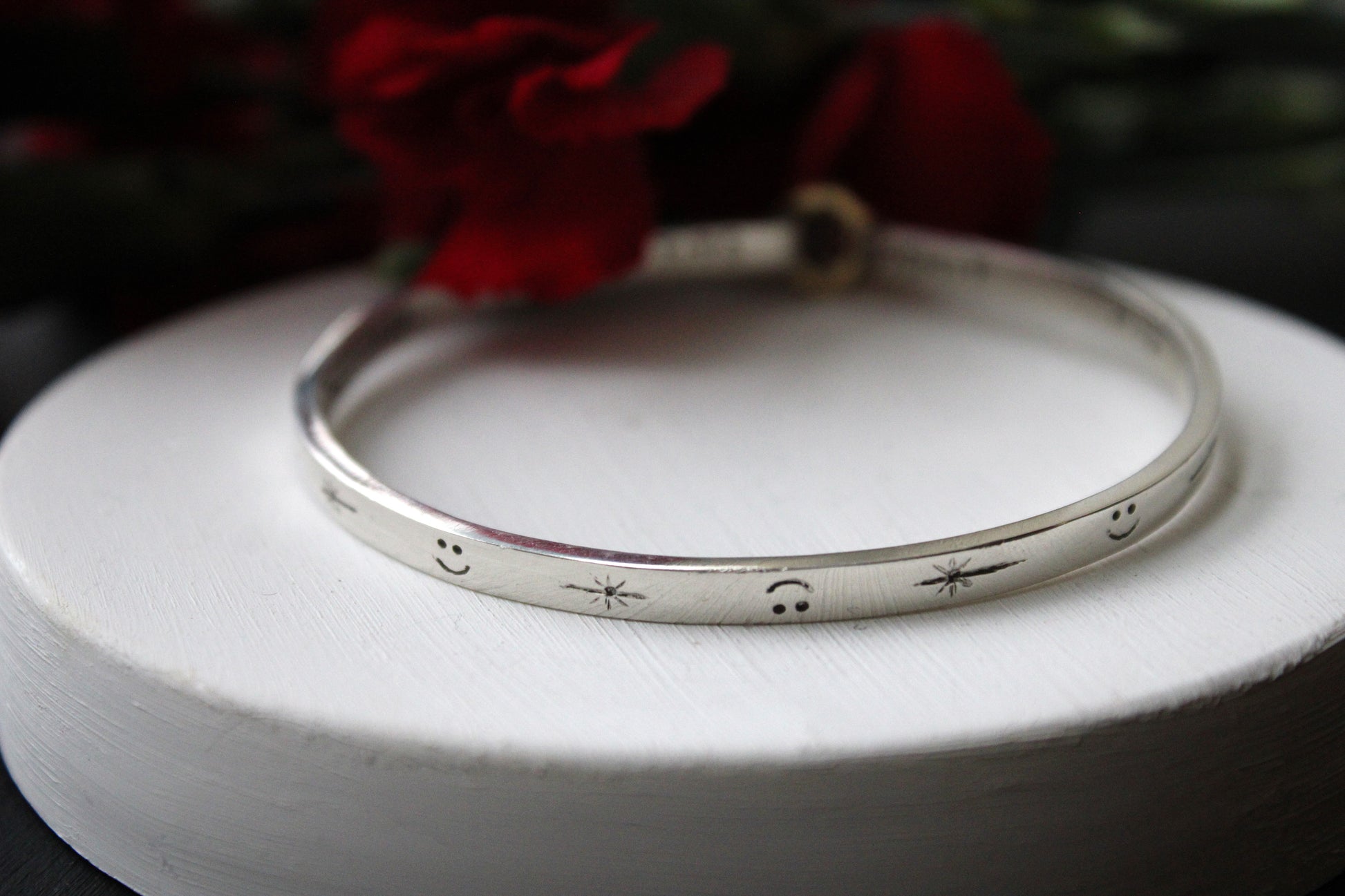 Keep your vulgarities on the inside and sarcastic smiles on the outside with this bangle inspired by the great comedian, George Carlin.