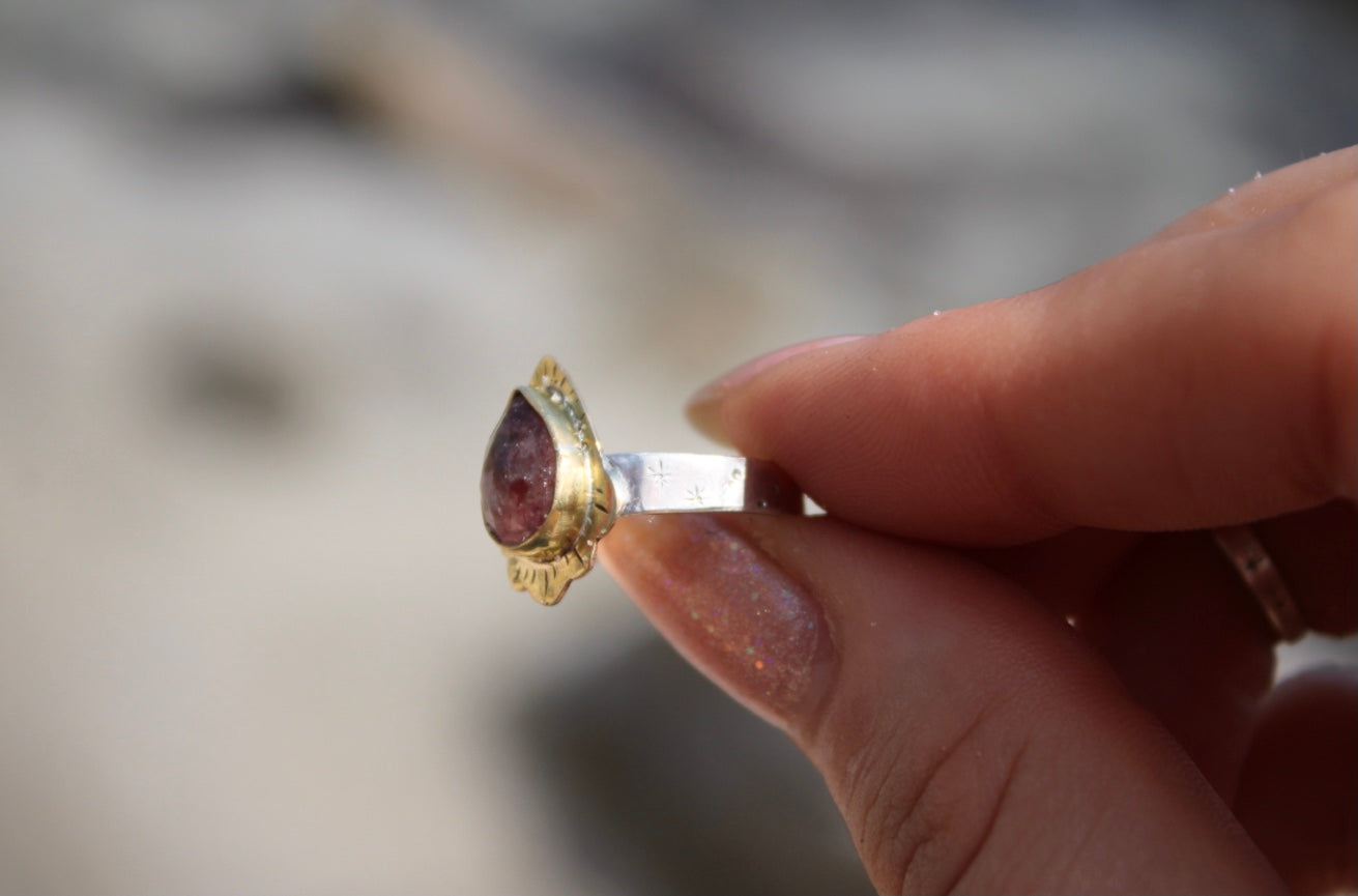 A juicy strawberry quartz sits in shining brass on a sterling silver band ring; hand engraved to resemble a starry sky.