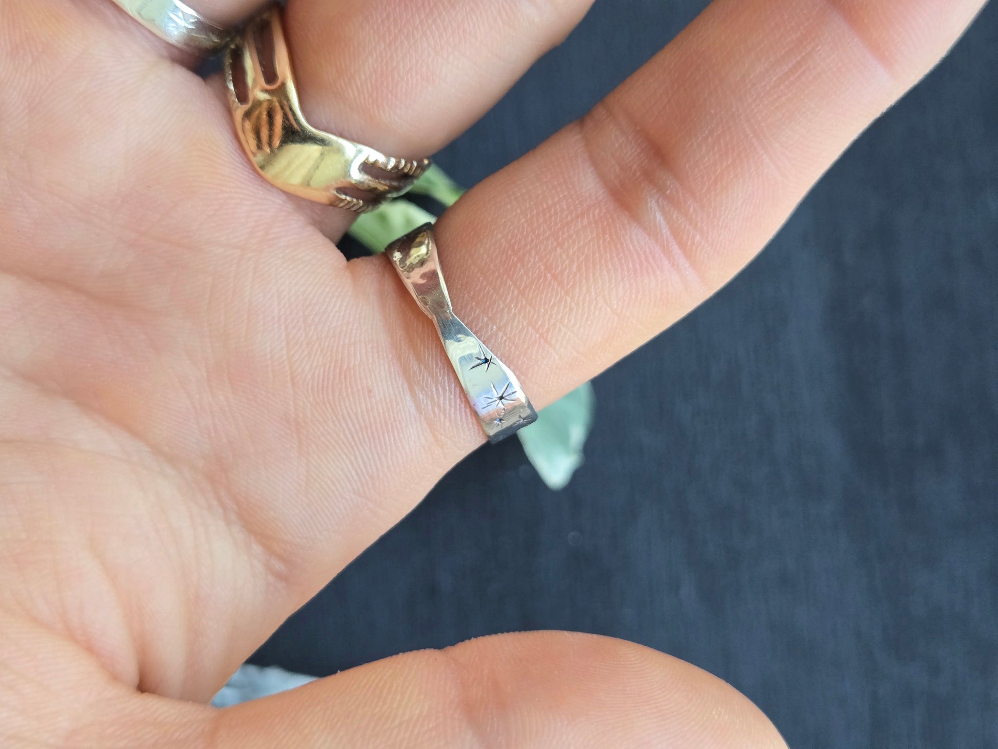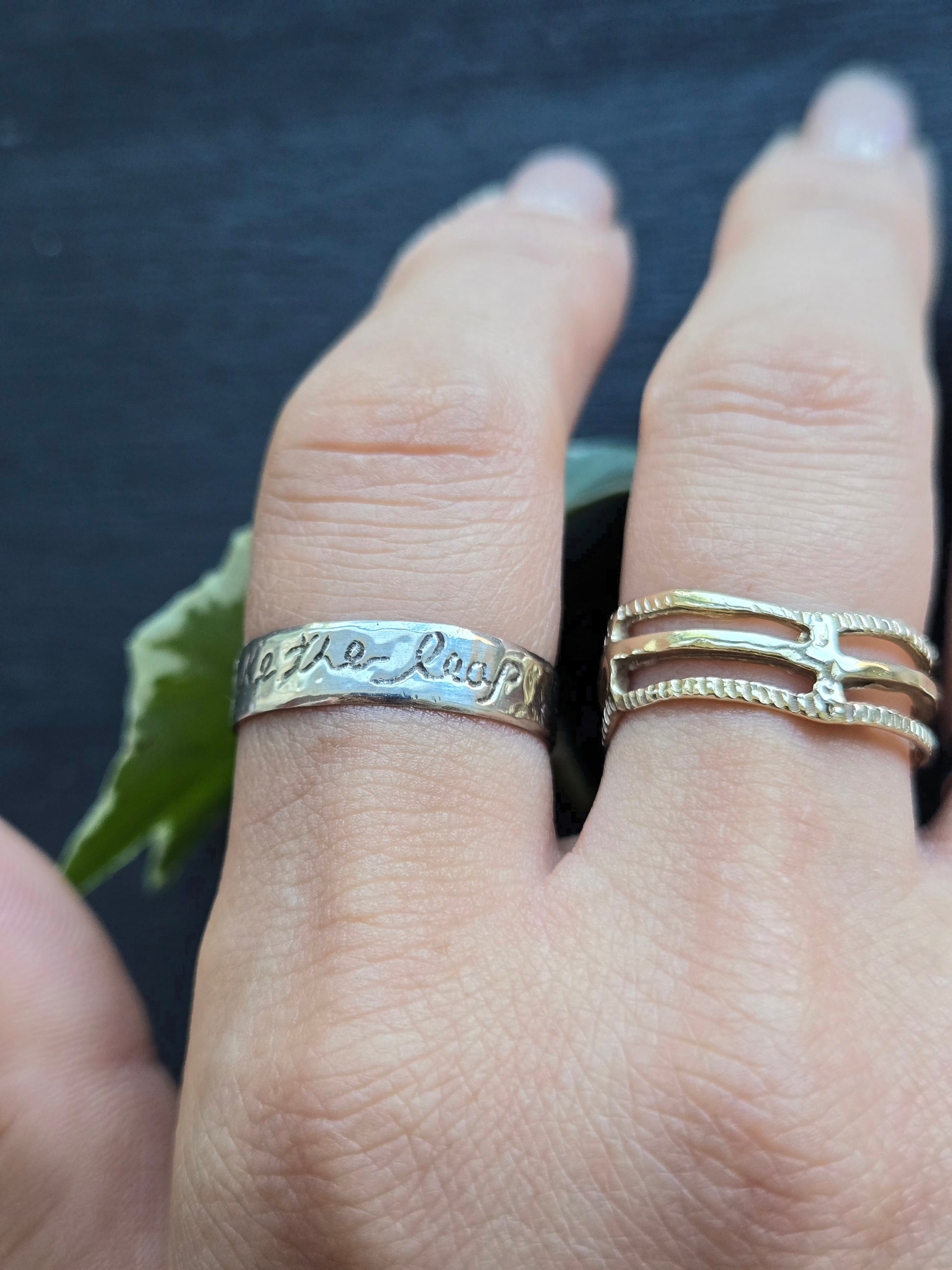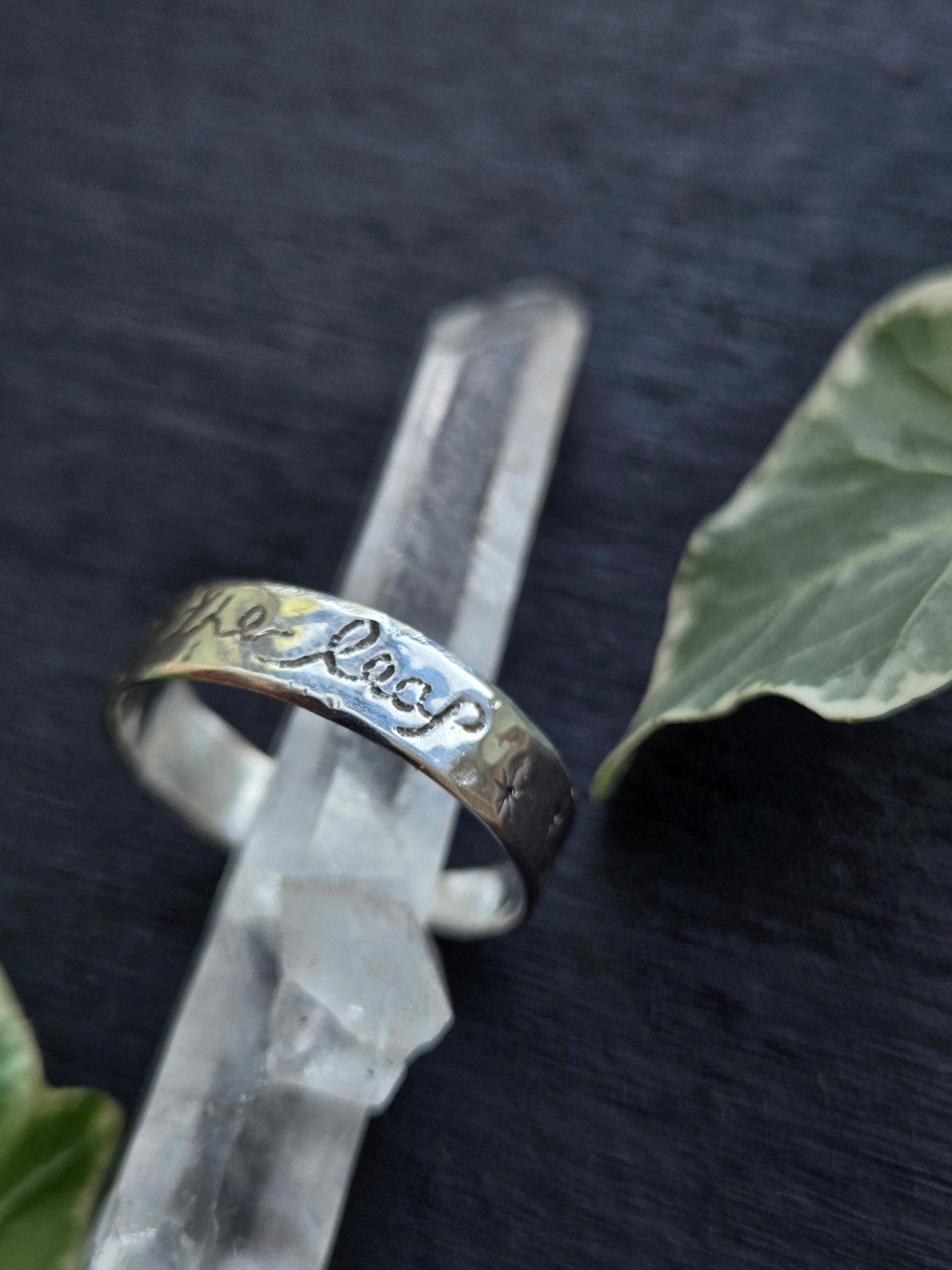 "Take the leap" is engraved in hammered sterling silver beside clusters of stars, as a reminder to listen to what's calling you from the unknown.