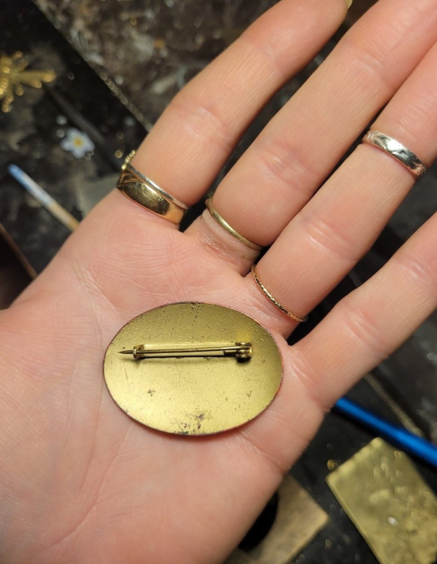 This whimsical vintage pin was looking a little unhinged until I got my hands on it; I painted life back into her hollow eyes and added more detail everywhere, sealed with resin and attached a vintage brass chevron chain. 16” total length.