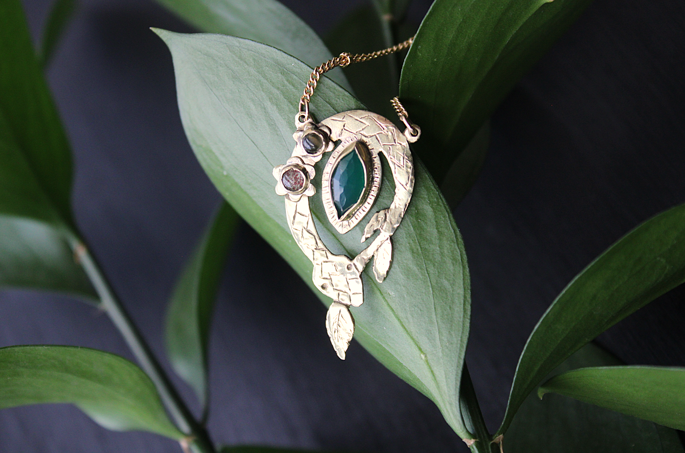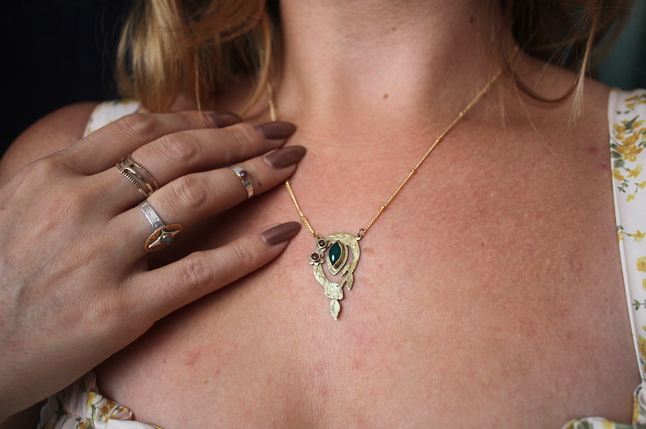 Engraved brass with strawberry quartz and citrine flowers, and a green onyx centre. Hanging from a 20" gold-filled chain with a 2" extender.