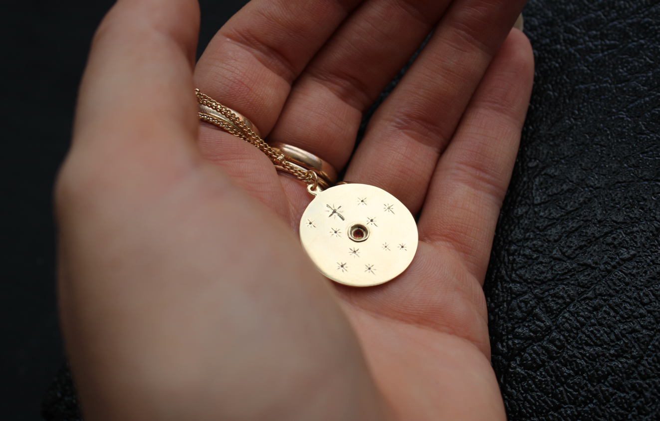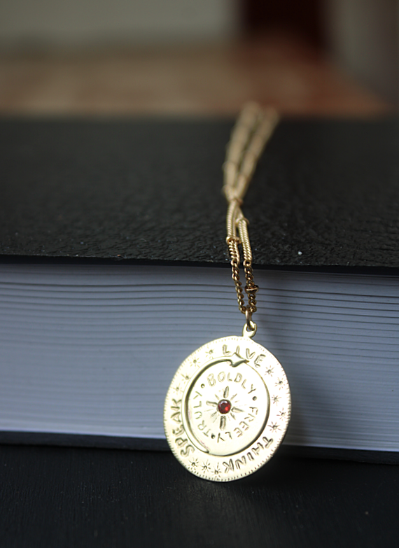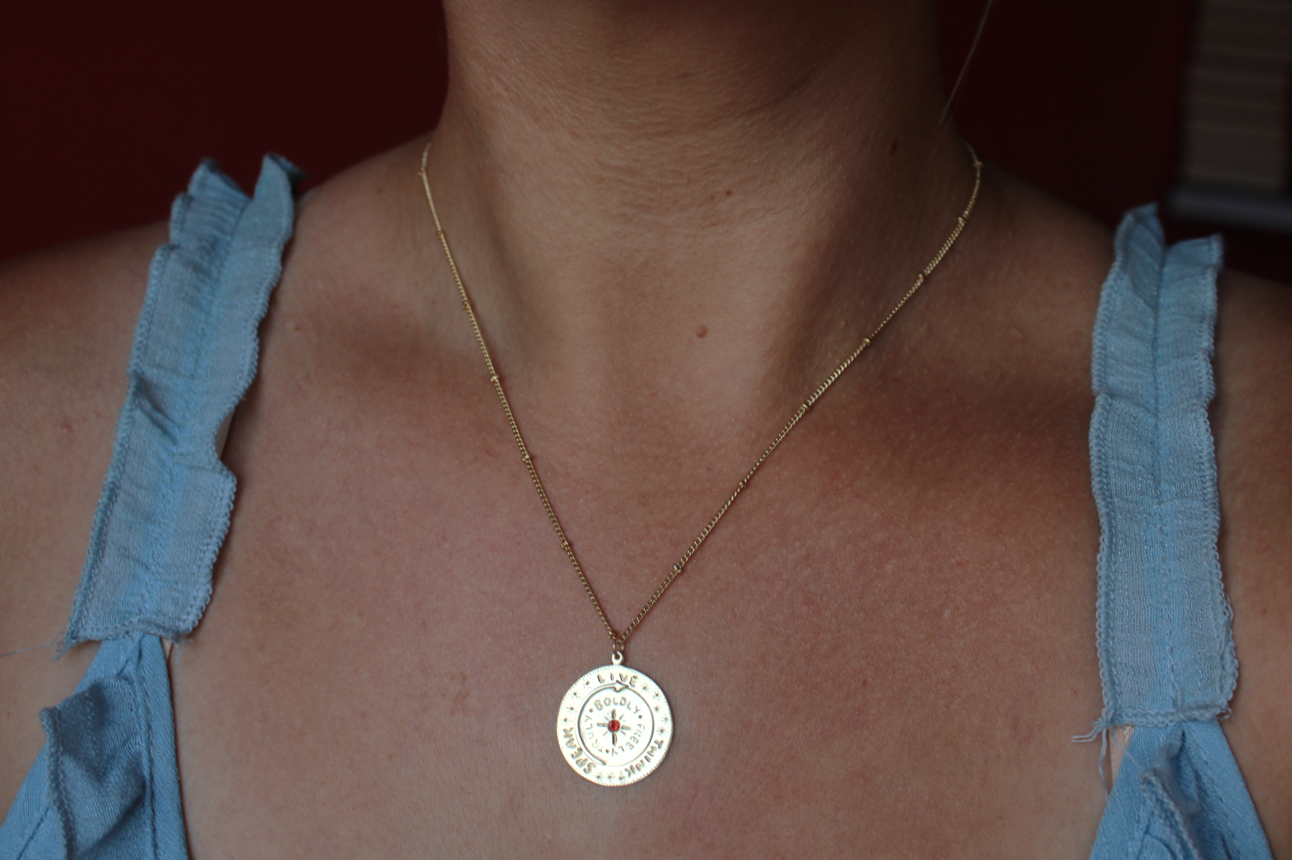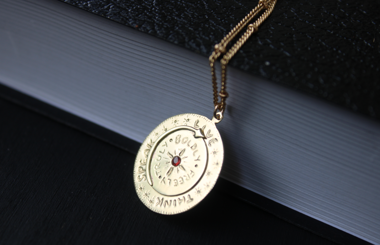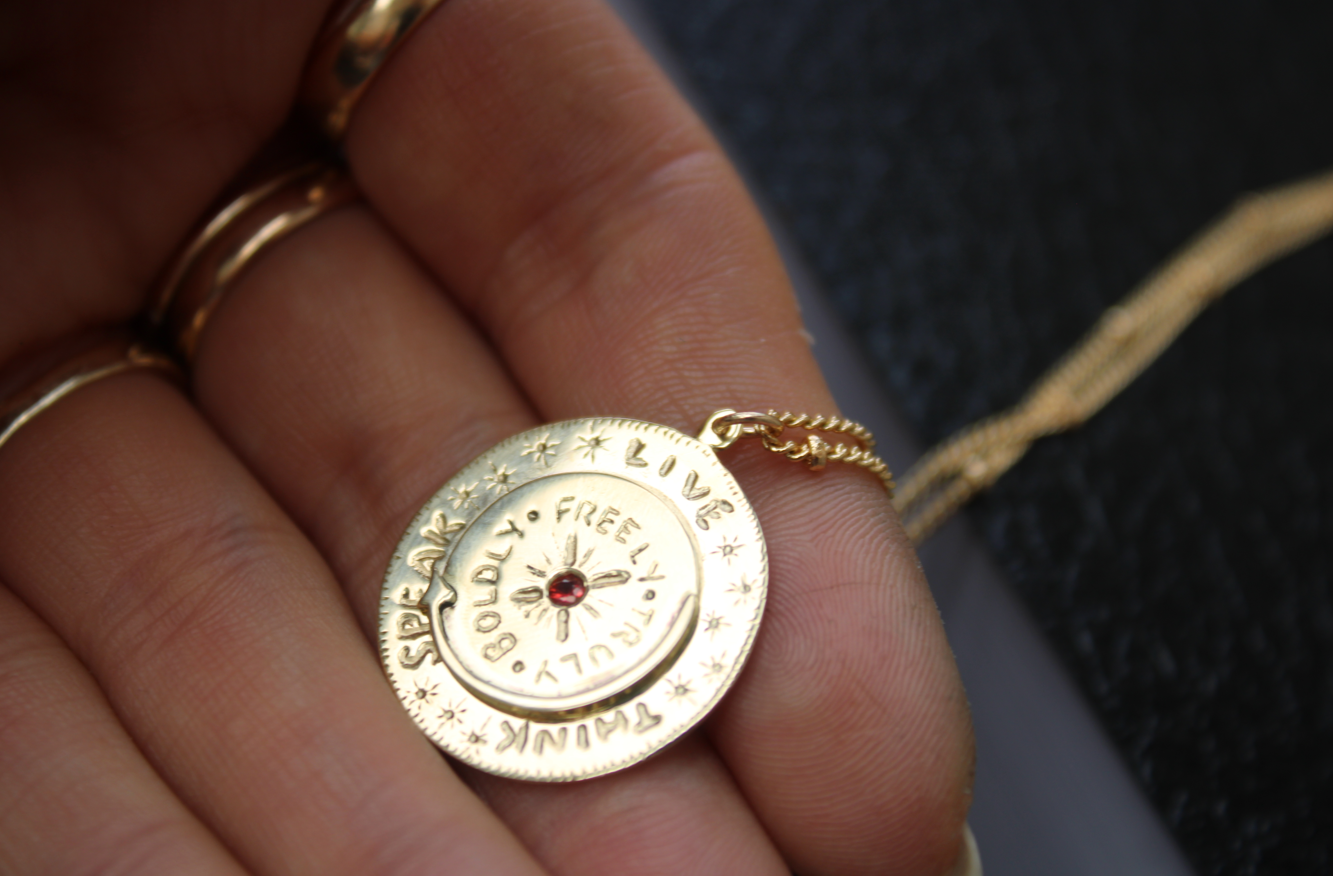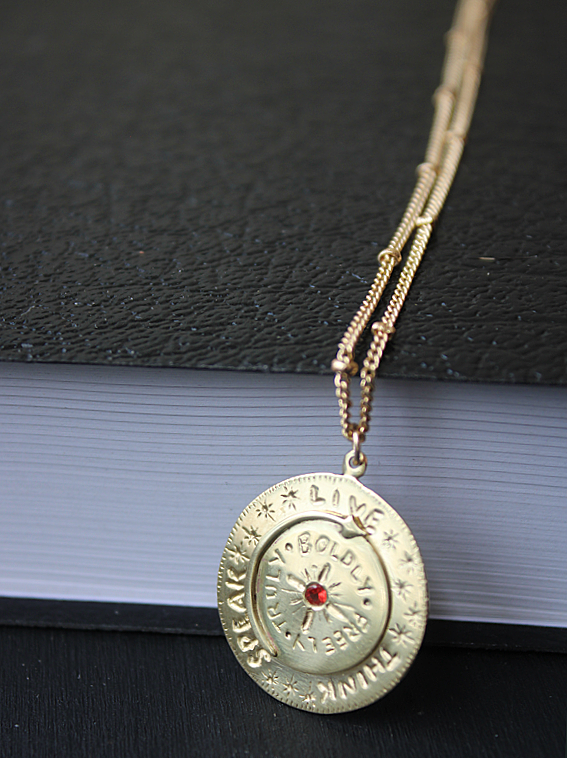 Represent your values and stand for what's right with this moveable brass pendant. Hand-engraved with a red sapphire at it's turning point, hanging from an 18" gold-filled chain with a 2" extender.